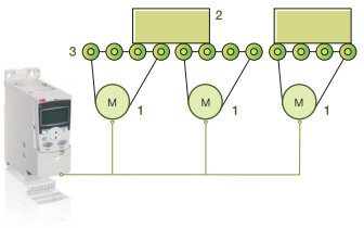 There are several ways to build an ABB multi-motor setup with ABB micro drives. Master-slave control, parallel control of motors and combinations of these two ways. The most typical ABB multi-motor setup for compact drives is the parallel control, which means that several motors are powered by one inverter (parallel connection of motor windings). The benefits of such approach are that there is only one inverter to startup, and that less time and effort is needed for the installation work. Multi-motor setup is possible only with asynchronous motors.