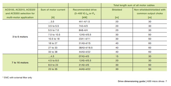 Correct selection of drive is critical with this kind of ABB multi-motor setup. This is due to the fact that increased amount of common mode current will reduce the loading current capability of the drive. Factors that affect drive load ability and the amount of common mode current:
