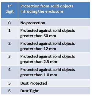 The first digit indicates the degree that persons are protected against contact with moving parts (other than rotating shafts) and the degree that equipment is protected against solid bodies intruding into an enclosure. The second digit indicates the degree of protection of the equipment inside the enclosure against harmful entry of various forms of moisture (i.e. submersion, dripping, spraying).