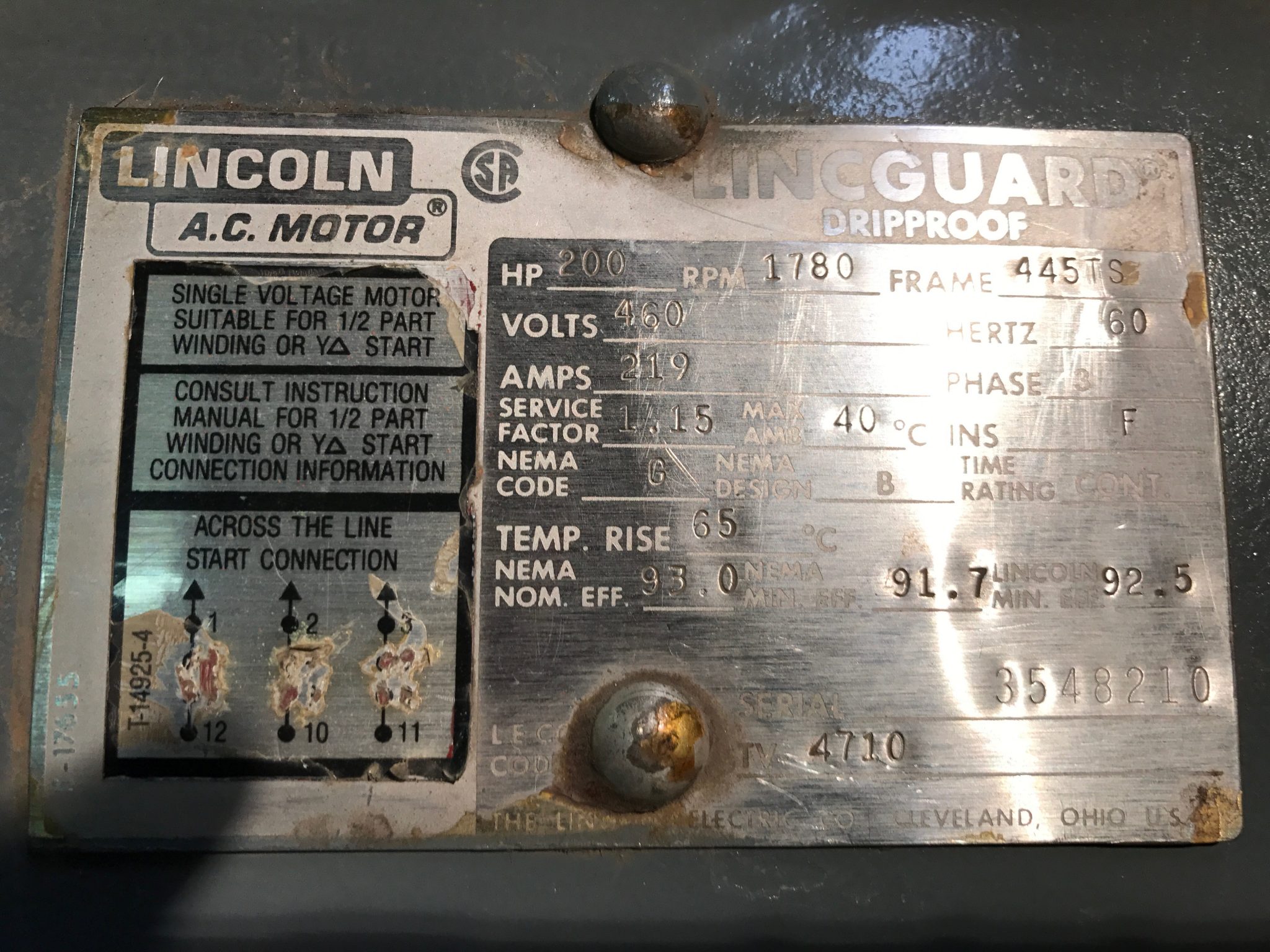 Lincoln Electric, 200 HP, 1780 RPM, 445TS Frame, 460 VAC, ODP