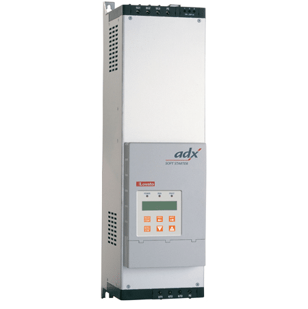 A close-up view of the Lovato ADX softstarters, highlighting the advanced control panel and technical features.