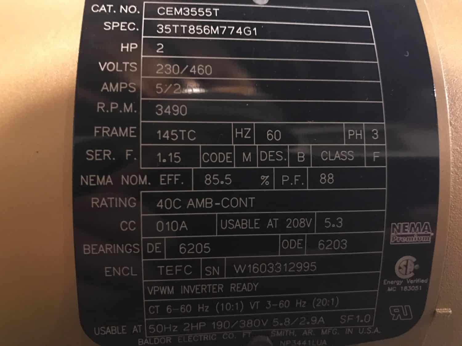 Baldor, 2 HP, 3490 RPM, 145TC Frame With Base, 230/460, TEFC.