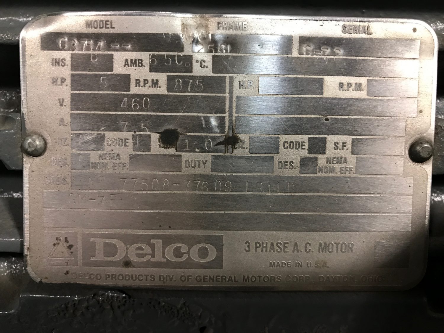 Delco Electric Motor, 5 HP, 256TC Frame, 875 RPM, 460 VAC, TEFC
